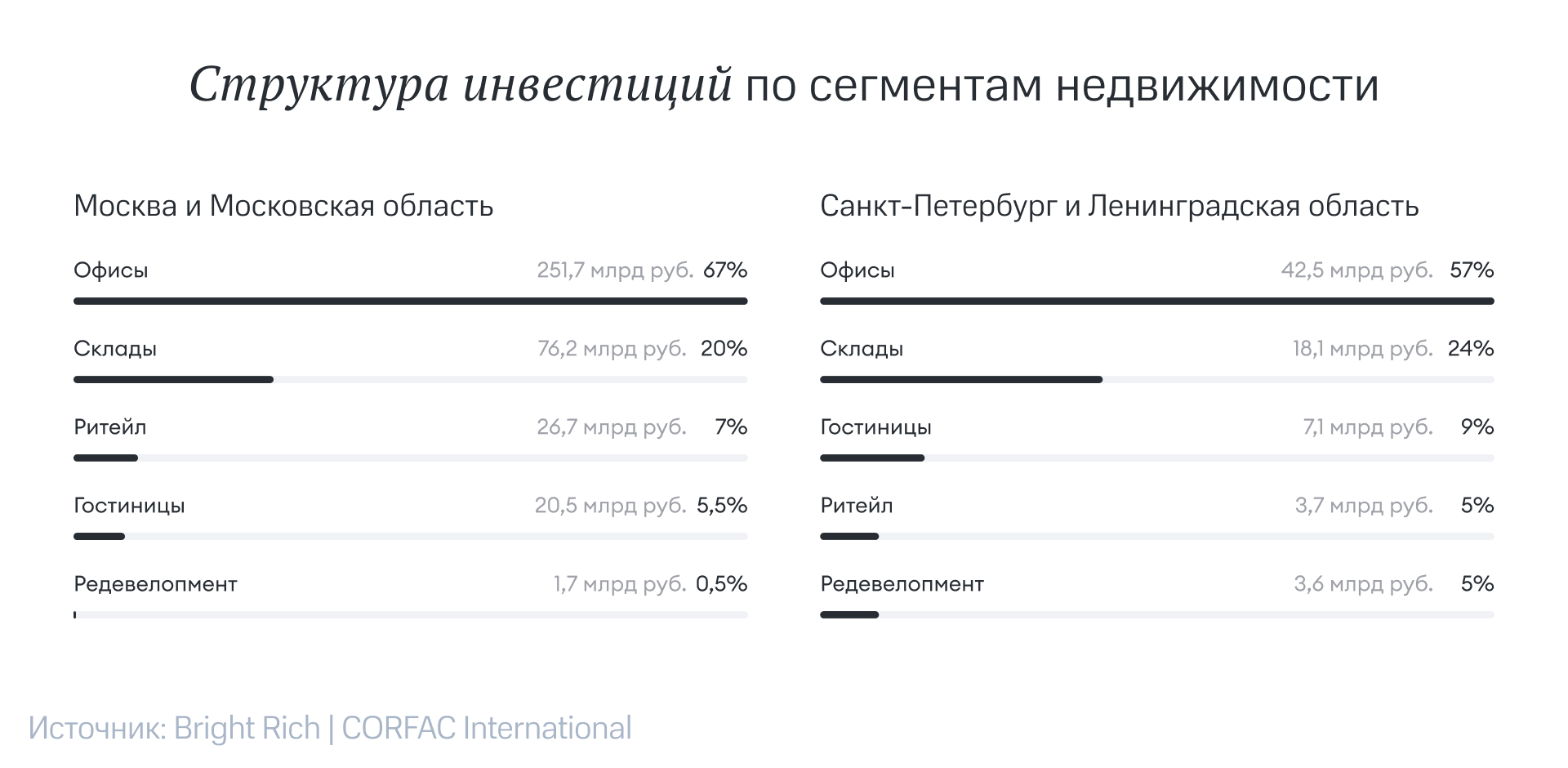 Виктор Заглумин, сооснователь и партнер Bright Rich | CORFAC Int.: «По итогам 2025 года в двух столицах в коммерческую недвижимость инвестировали 452 млрд руб., то есть на 35% меньше, чем годом ранее. Спрос перераспределился: офисы перетянули внимание на себя, обогнав склады, гостиничный сегмент набирает популярность. При этом значительная часть активов ушла с торгов: таким образом, инвесторы показали готовность вкладываться в коммерческую недвижимость, но на наиболее выгодных для себя условиях, выбирая недооцененные активы с потенциалом роста капитализации».