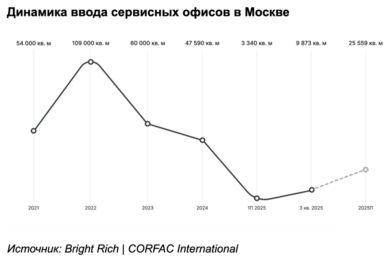По данным консалтинговой компании Bright Rich| CORFAC International, по итогам 2025 года в Москве будет введено всего 25 559 кв. м гибких офисов (3 579 рабочих мест). В сравнении с показателями предыдущих четырех лет это: