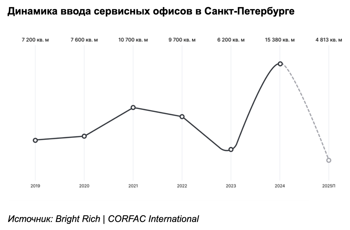 На рынке Санкт-Петербурга ситуация аналогичная: по итогам 2025 года там будет введено 4 813 кв. м сервисных офисов (625 рабочих мест). В сравнении с показателями предыдущих четырех лет это: