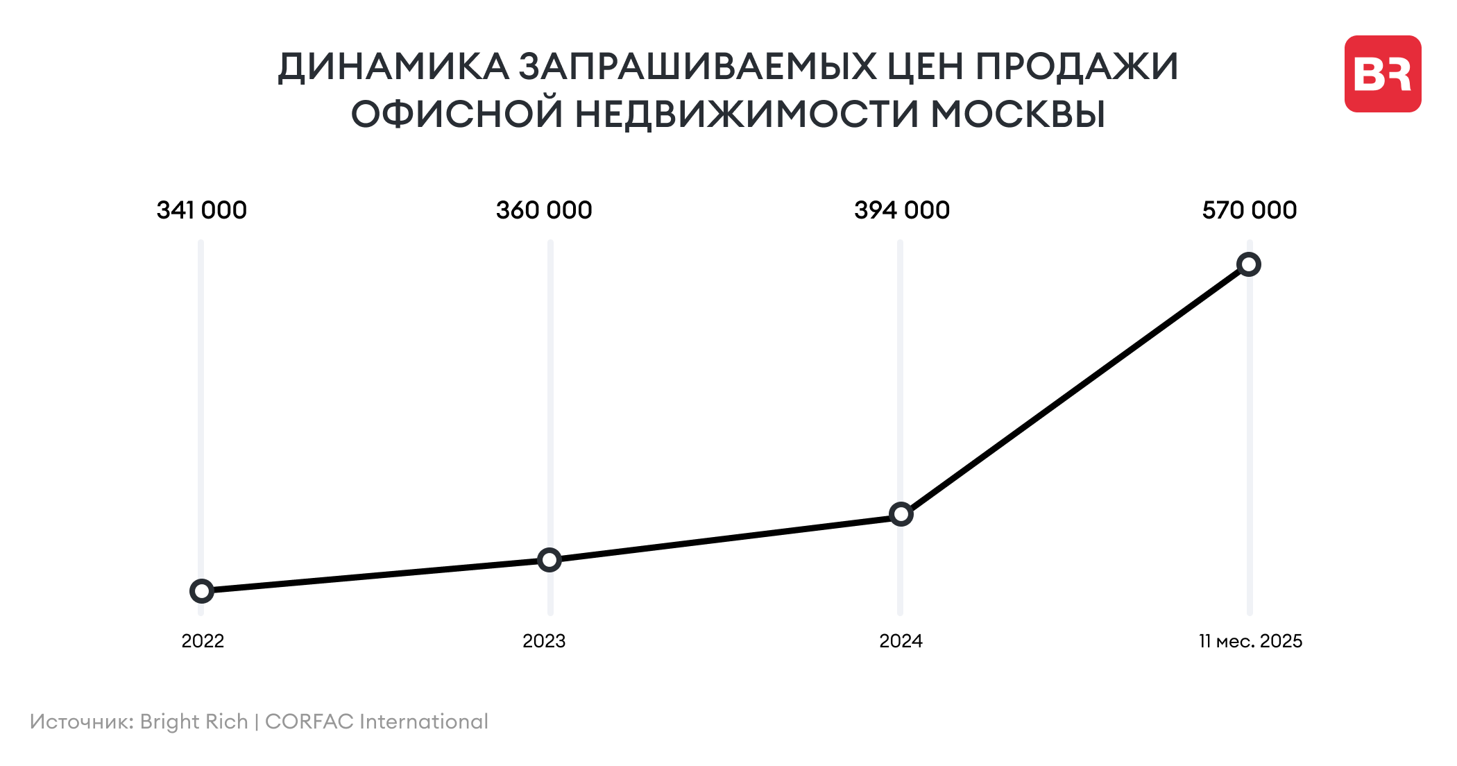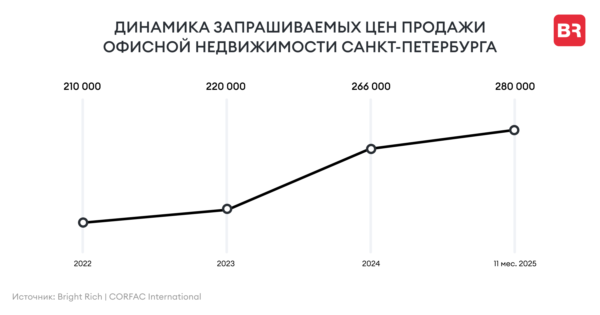 По данным консалтинговой компании Bright Rich | CORFAC International, средние запрашиваемые цены продажи офисных площадей в готовых объектах класса А в Москве и в Санкт-Петербурге уже который год демонстрируют положительную динамику. Так, в ноябре 2025 года в Москве этот показатель достигает 570 тыс. руб./кв. м (с НДС), что на 44,7% больше аналогичного показателя по итогам 2024 года (394 тыс. руб./кв. м).